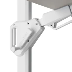- De zweefparasol heeft een wit frame met een manhattan doek